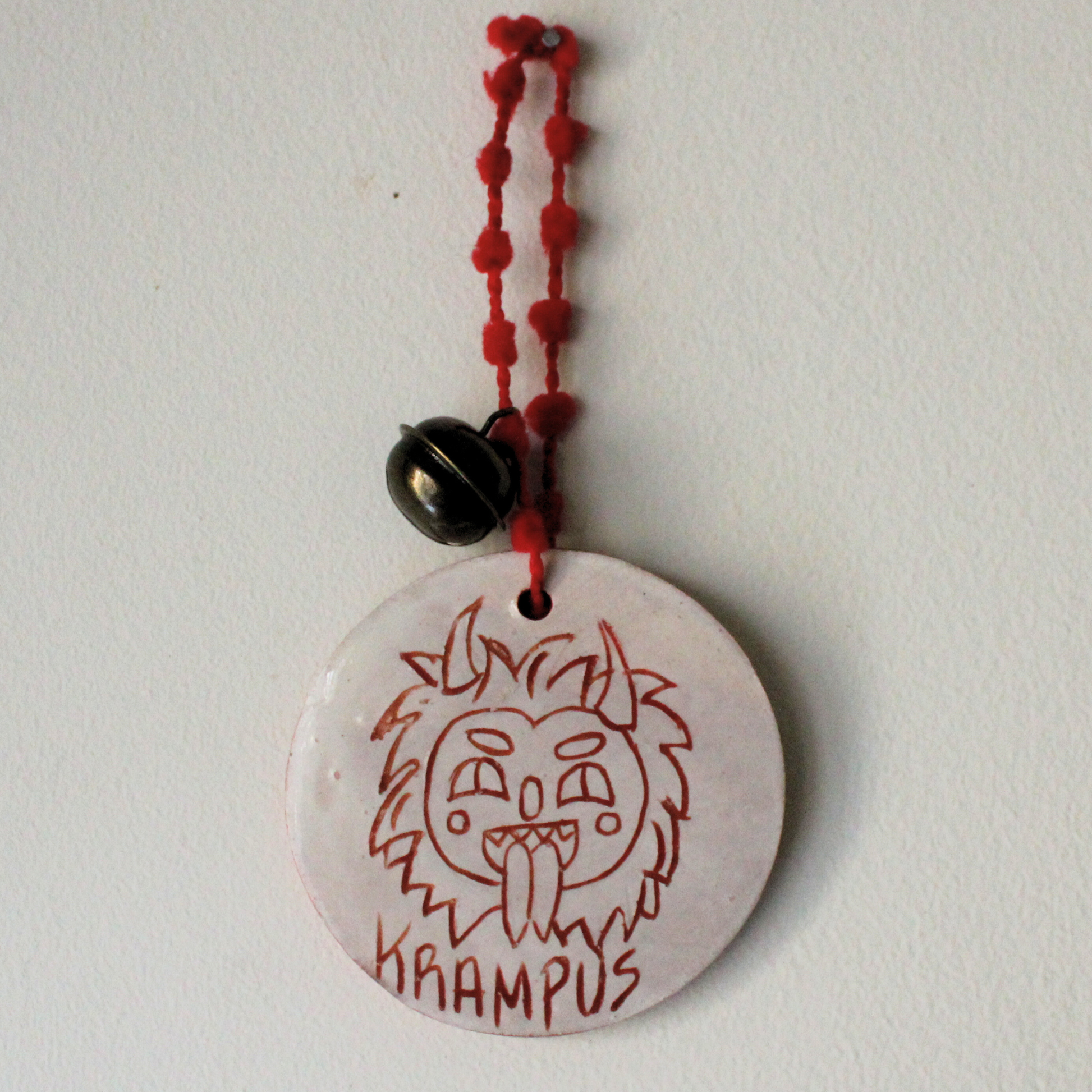 Terracotta cutie Krampus ornament with red glaze underlay and ribbon with bell adornment.