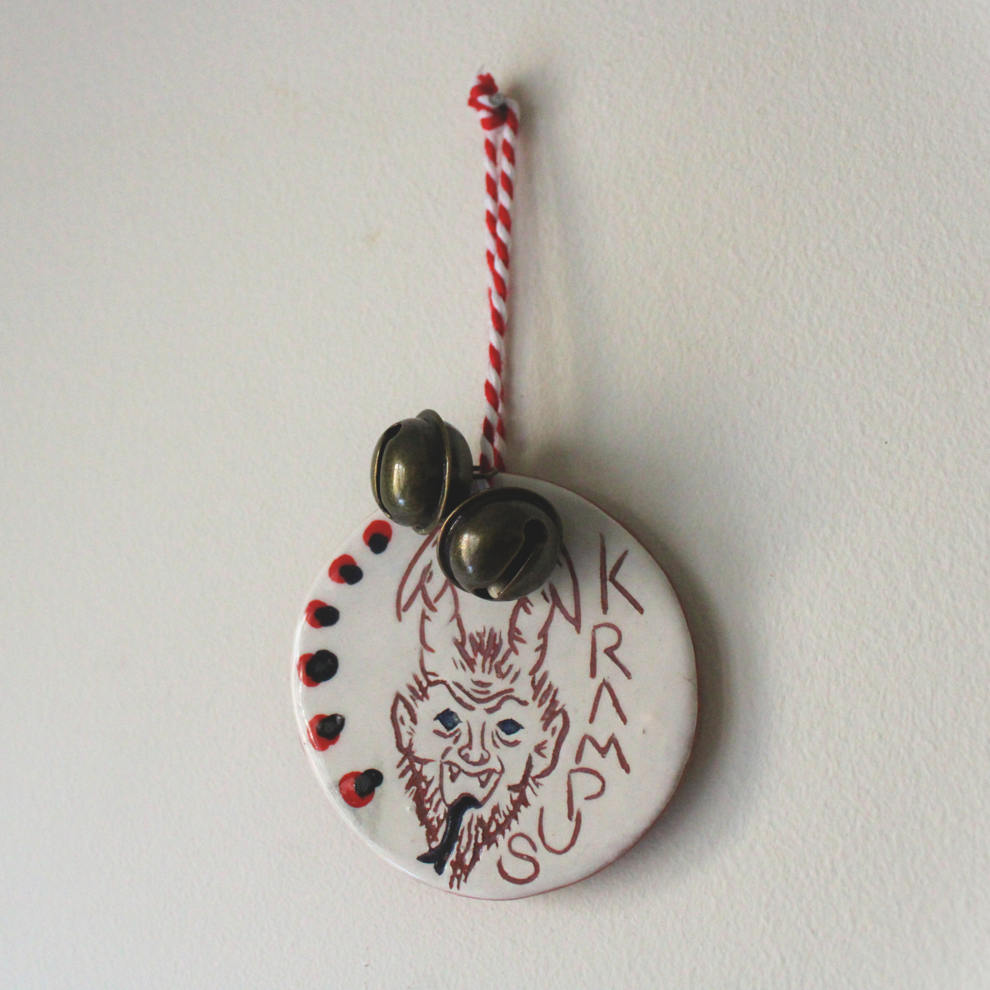 Terracotta demonic Krampus ornament with red glaze underlay and ribbon with bell adornment.