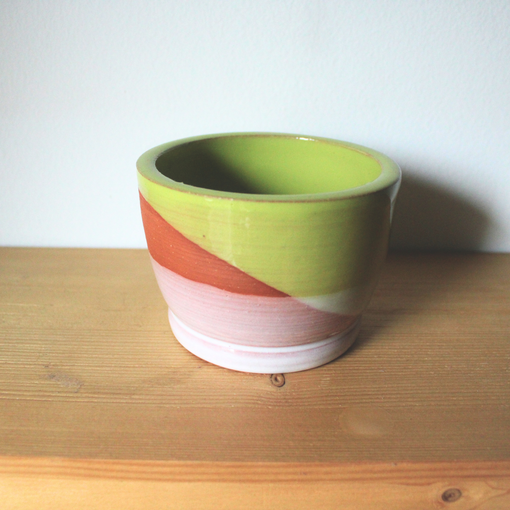 Small terracotta vase with green & white glaze. Food, dishwasher, and microwave safe.