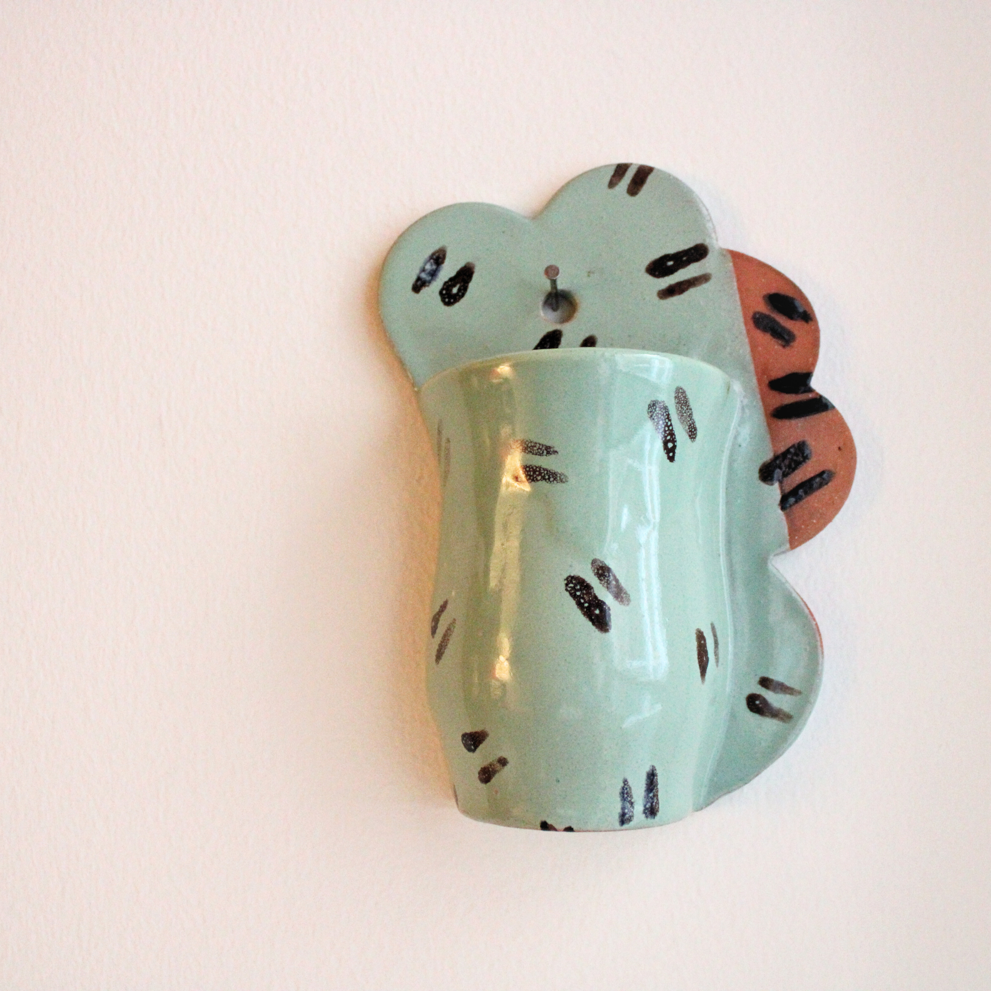 Terracotta wall pocket with turquoise glaze and black underglaze design.