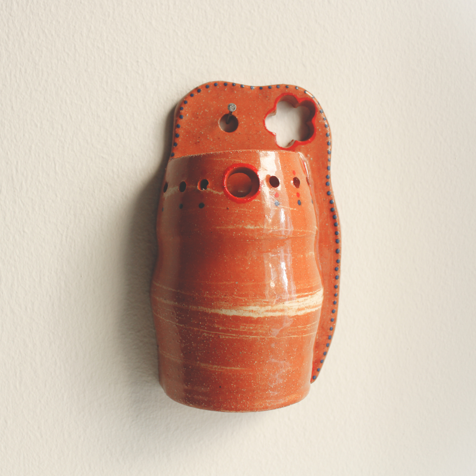Terracotta wall pocket with red and blue underglaze designs and decorative cutouts.