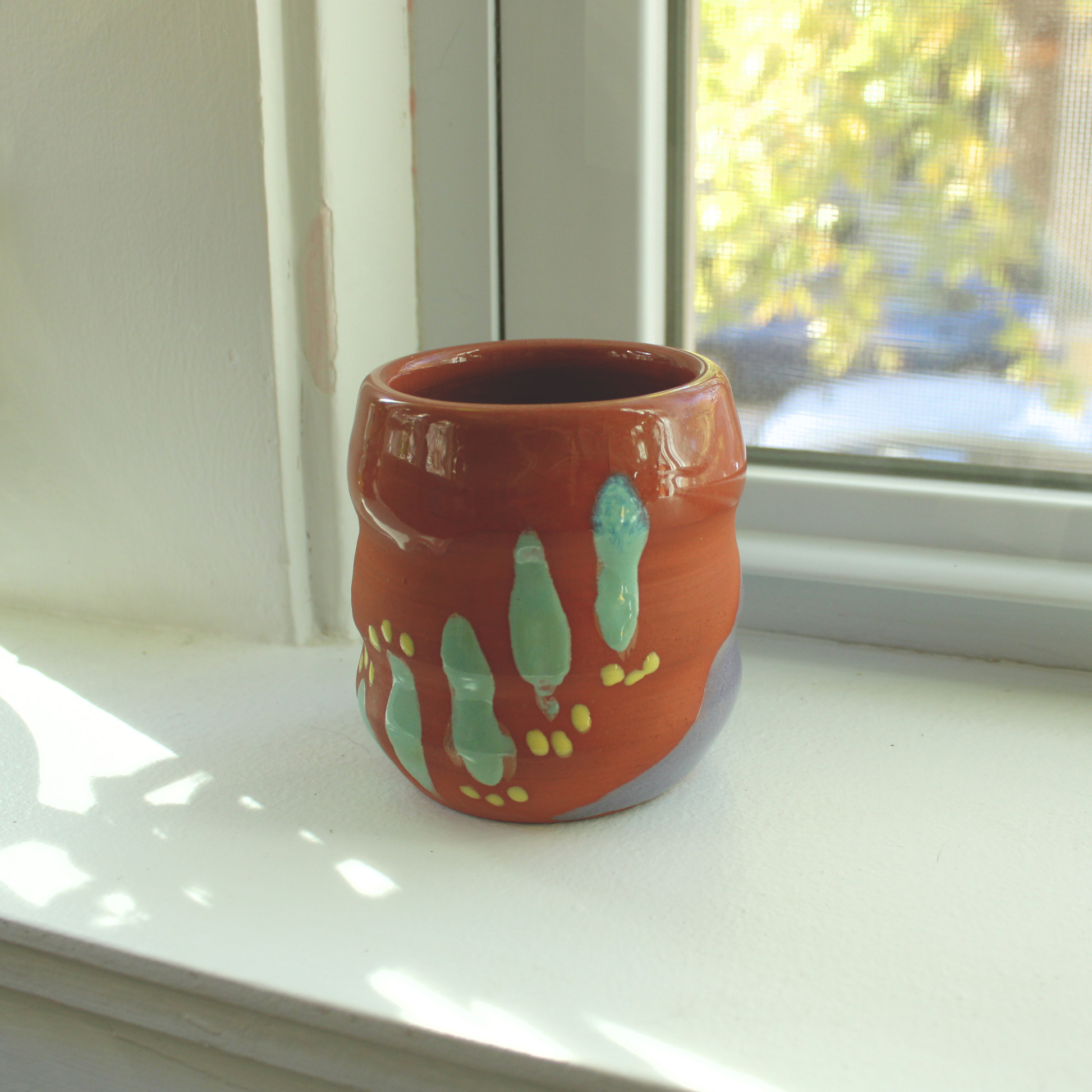 Terracotta cup with teal, yellow & lilac glaze. Food, dishwasher, and microwave safe.