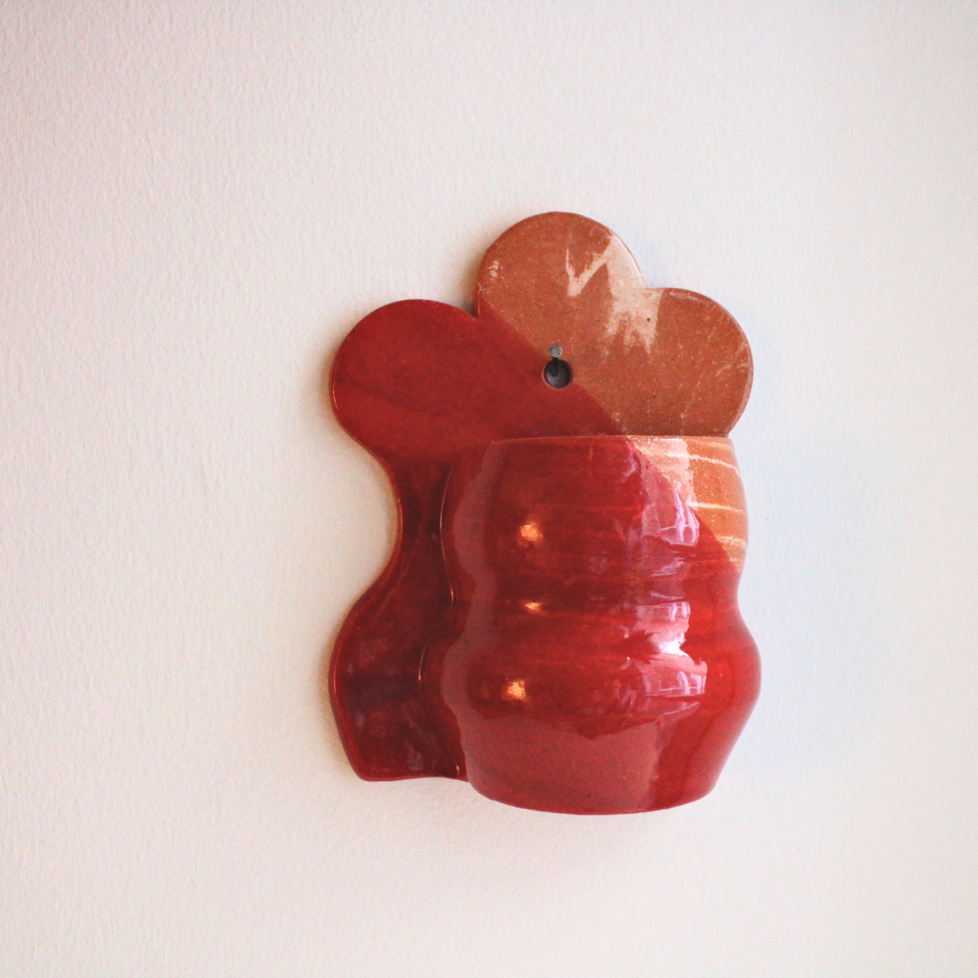 Terracotta wall pocket with white marbling and red glaze.